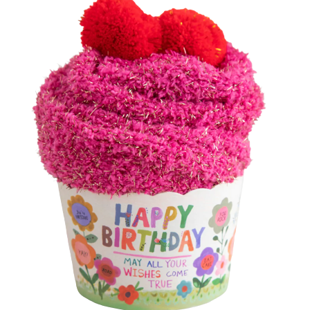 An adorable gift of cozy socks wrapped up in the shape of a cupcake.